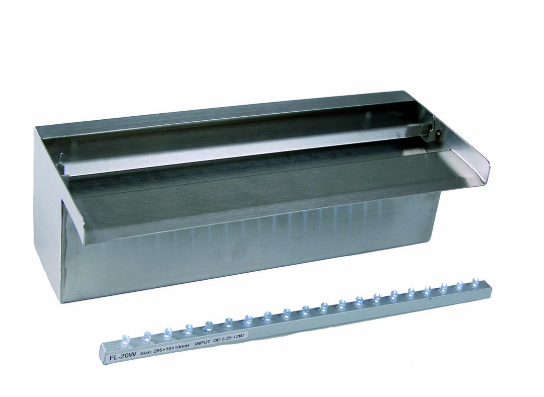 Deze waterval heeft 2 aansluitmogelijkheden aan de achter- of onderkant met 1" binnendraad en 25 mm slangaansluiting. De waterval heeft een afmeting van HxBxD 10 x 30 x 12,5 cm. Wij adviseren u de waterval in een schanskorf te verwerken die minimaal 25 cm breed is, zodat u genoeg ruimte heeft aan de achterzijde om deze met stenen te vullen.