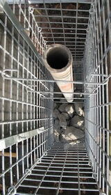 De bovenzijde van de buis komt ongeveer 20 cm onder de bovenzijde van de schanskorf. Hij wordt in het midden van de korf aangebracht, zodat hij na het vullen met natuursteen niet meer zichtbaar is.